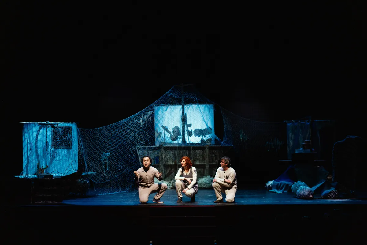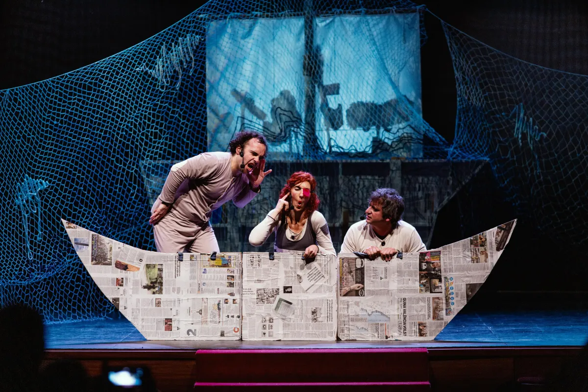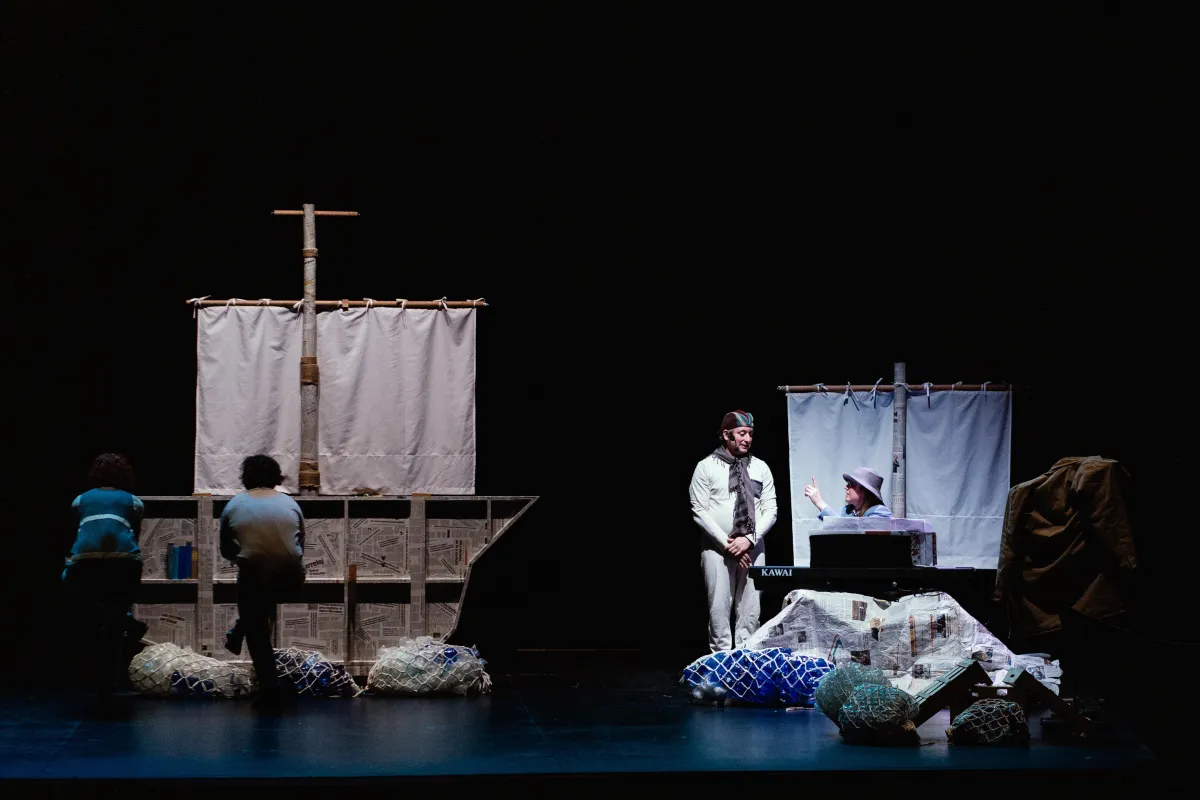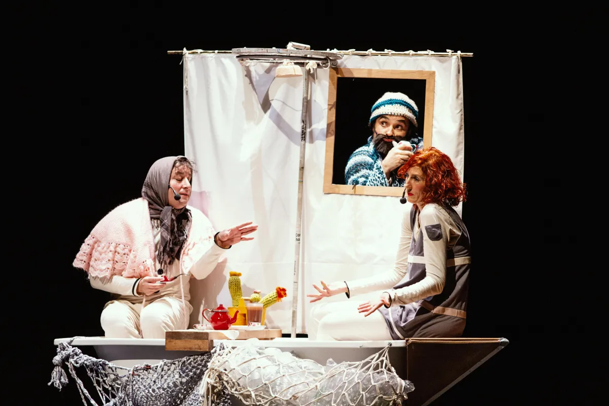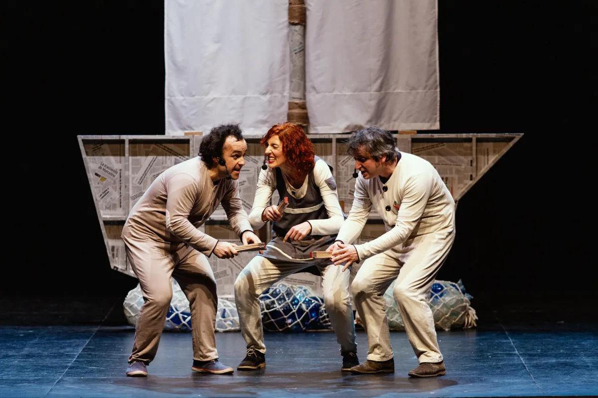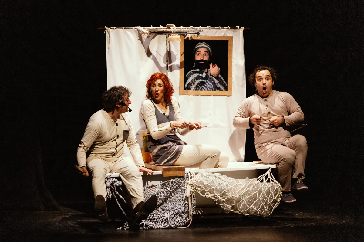 La Cía “Yo, mí, me con mua”, una compañía teatral itinerante al estilo de las antiguas compañías de la legua, que iban de pueblo en pueblo contando historias, llega al teatro y, ante los ojos del espectador, despliega un gran pueblo de barcos de un montón de trastos apilados en el escenario.